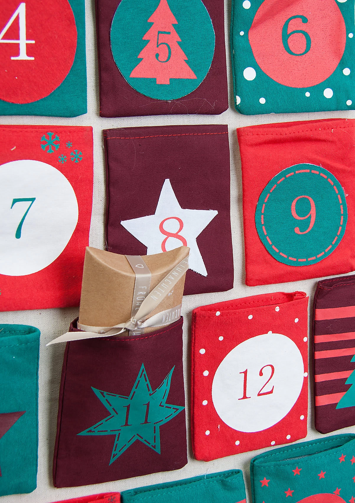 Die Vorweihnachtszeit ist doch die schönste Zeit! Versüße Dir den Dezember mit unserem tollen Adventskalender aus Stoff! Der Weihnachtsbaum besitzt einzelne Täschchen (Größe 8,5cm x 11 cm), die mit Zahlen und Weihnachtsmotiven verziert sind! An der Spitze des Baumes befindet sich ein Aufhänger, sodass der Kalender problemlos an der Wand befestigt werden kann! Der Stoffkalender kann individuell mit kleinen Geschenken oder Süßigkeiten befüllt werden!