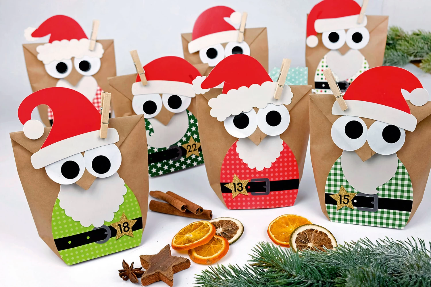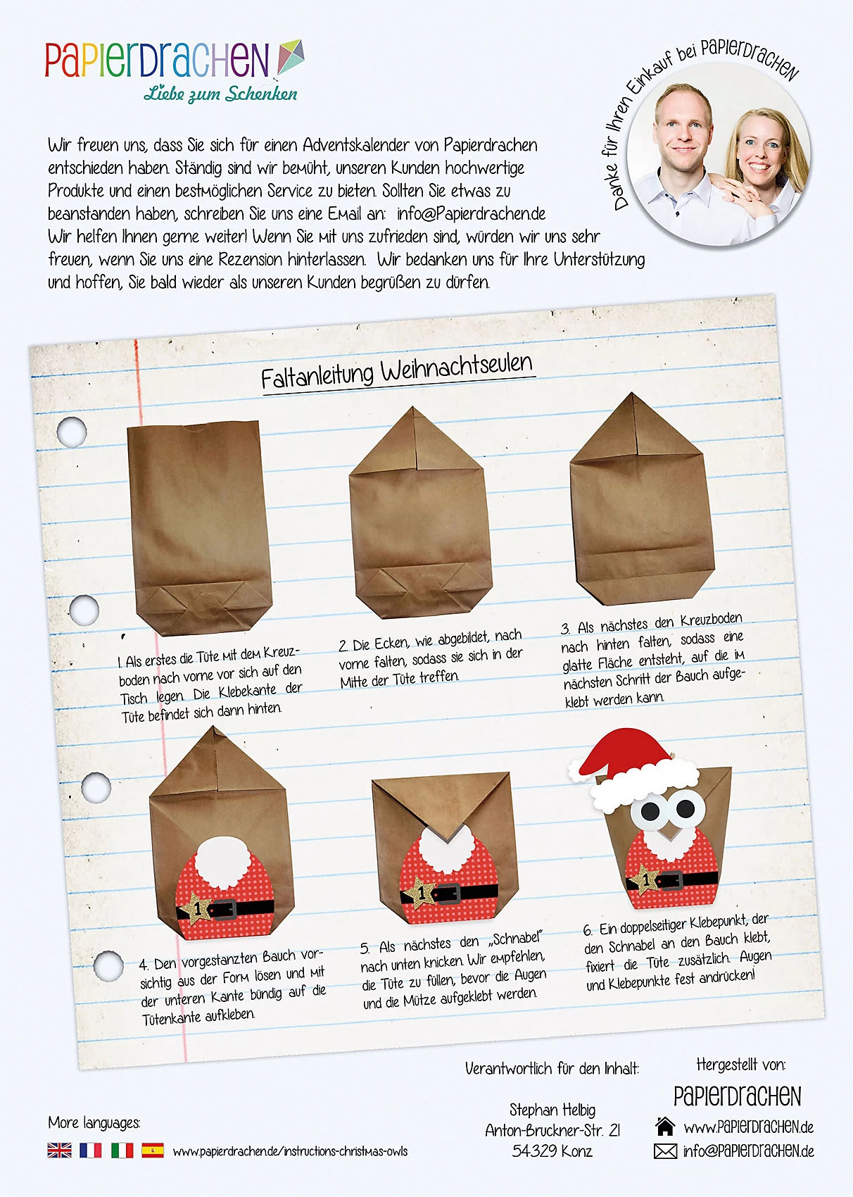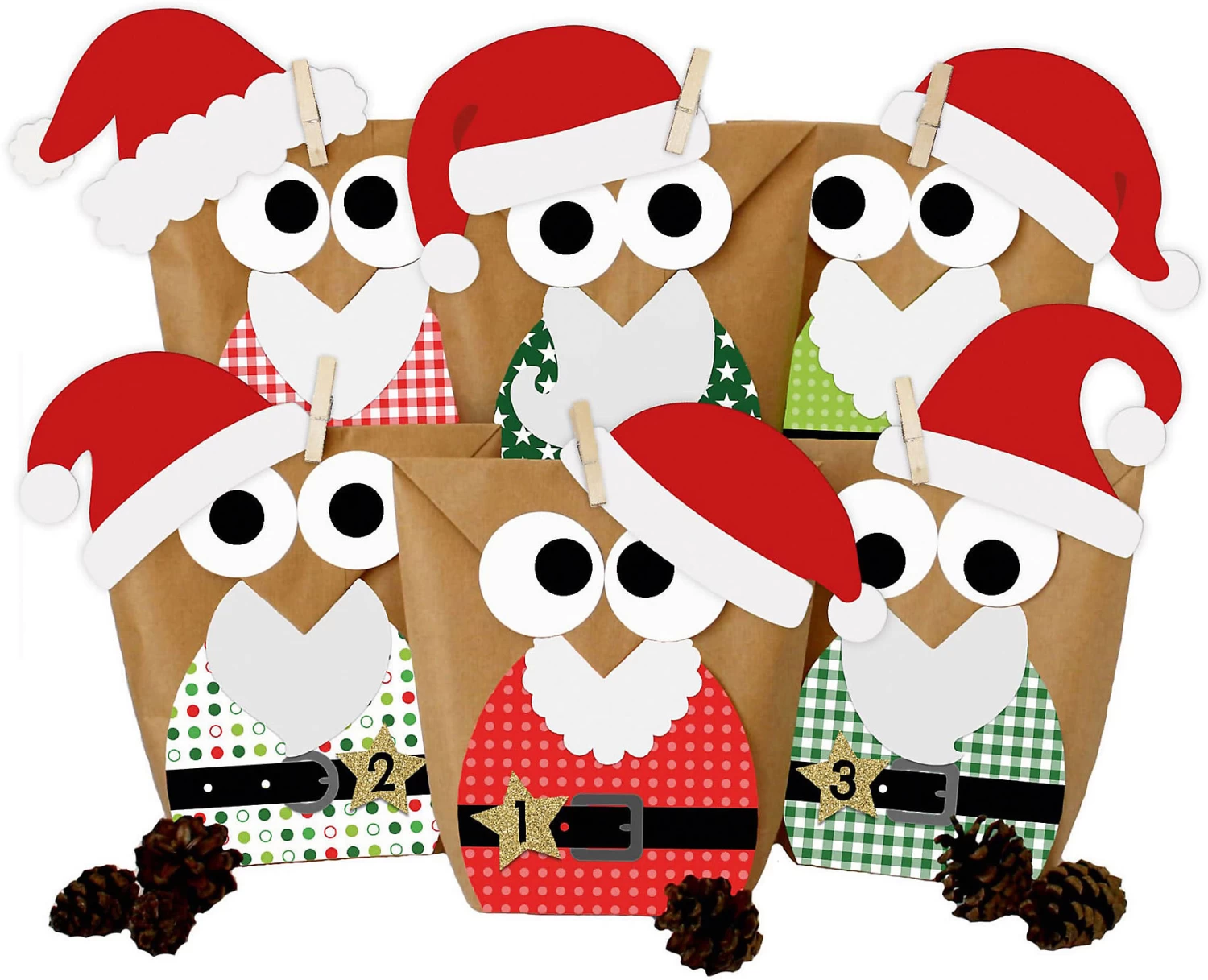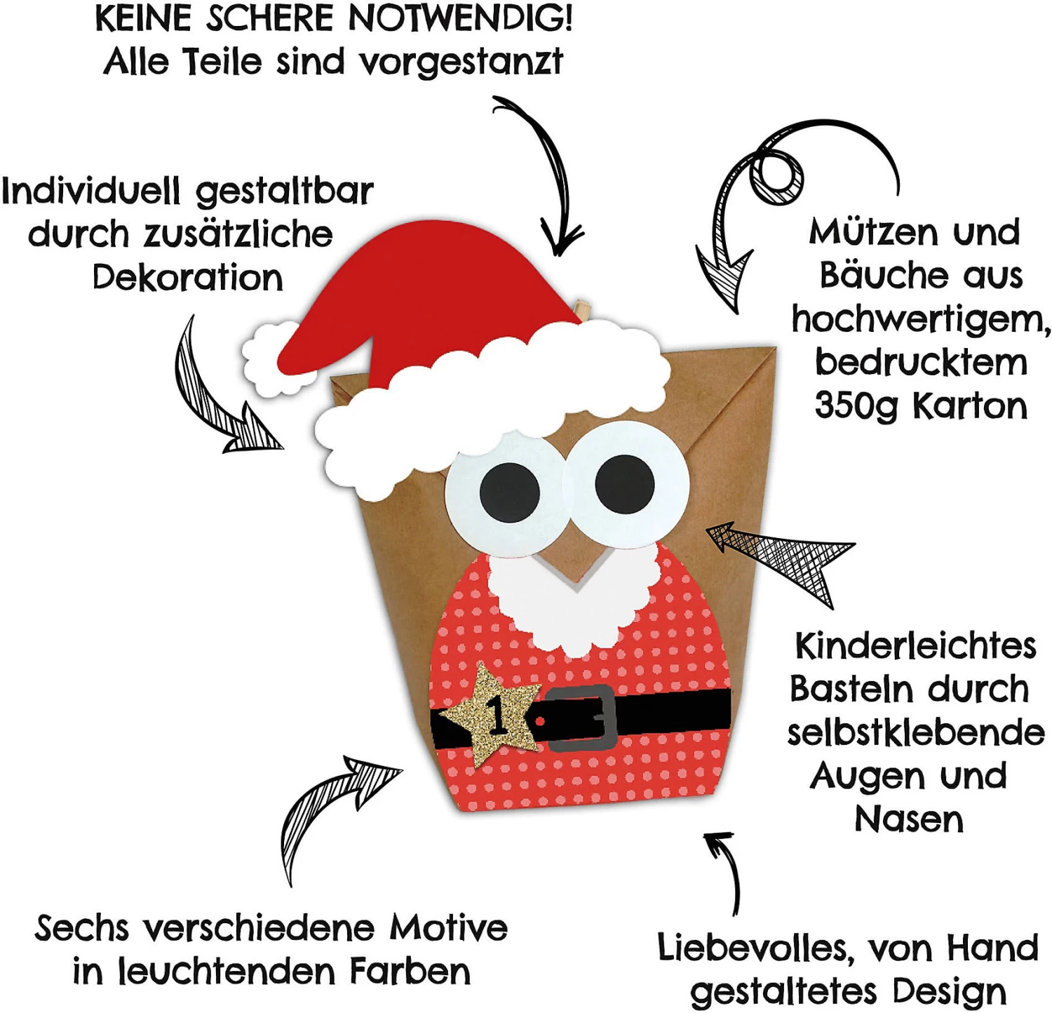Mit diesem Set haben Sie alles parat, was Sie zum Gestalten eines individuellen Adventskalenders brauchen. Zudem sorgt es für eine spaßige vorweihnachtliche Aktivität, denn beim Basteln, Dekorieren und Befüllen der hübschen Eulentüten kommt die ganze Familie zusammen! Auch die Kleinsten können mitmachen, schließlich wird keine Schere benötigt, denn alle Teile sind praktischerweise vorgestanzt und lassen sich ganz einfach aus der Form heraustrennen. Besonders viel Spaß macht es, die Eulen mit den roten Nikolaus-Mützen zu dekorieren!