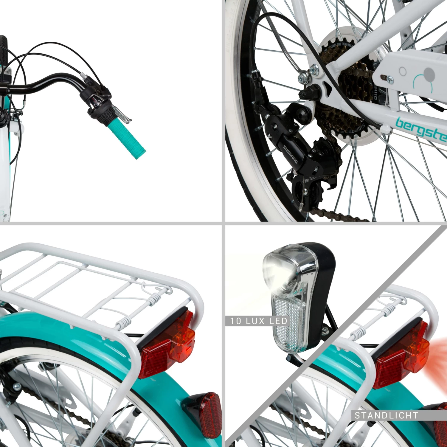 Zu den technischen Details ist zu sagen, dass das Modell Atlantis über einen extrem robusten Hi-Ten Stahlrahmen und einen geschlossenen Kettenkasten verfügt. Letzterer bietet den Vorteil, dass die Kette vor Steinen und Schmutz geschützt ist, was eine erhebliche Verringerung des Wartungsaufwands bedeutet. Für den richtigen Fahrkomfort sorgen die Shimano Kettenschaltung mit sechs Gängen, der Shimano Umwerfer, die Shimano RevoShift Drehgriffschaltung sowie die vordere und hintere V-Bremse. Die STVZO-konforme Beleuchtung ist dynamobetrieben, das Rücklicht verfügt zudem über eine Standlichtfunktion.