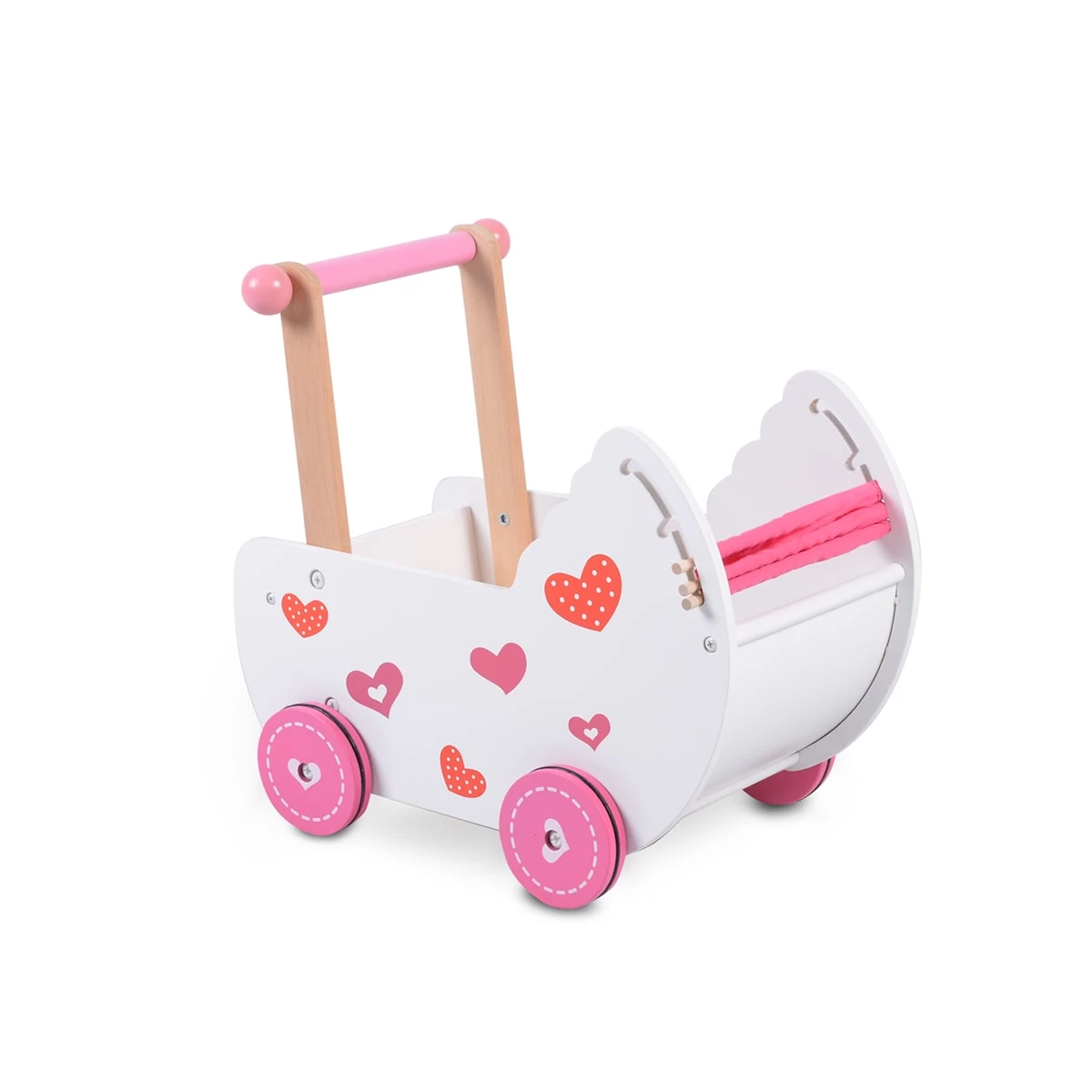 Dieser Holz Puppenwagen 2150 von Moni, ist perfekt für kleine Mamis und Papis. So kann Ihr Kind bei jeder Gelegenheit mit ihrer Lieblingspuppe spazieren gehen. In dem Wagen kann die Lieblingspuppe oder ein anderes Lieblingsspielzeug mitgeführt werden. Gleichzeitig dient der Puppenwagen auch als Lernwagen. Als praktischer Begleiter schult es das Gleichgewicht, fördert die Fantasie und regt zu nachahmenden Rollenspiele an.