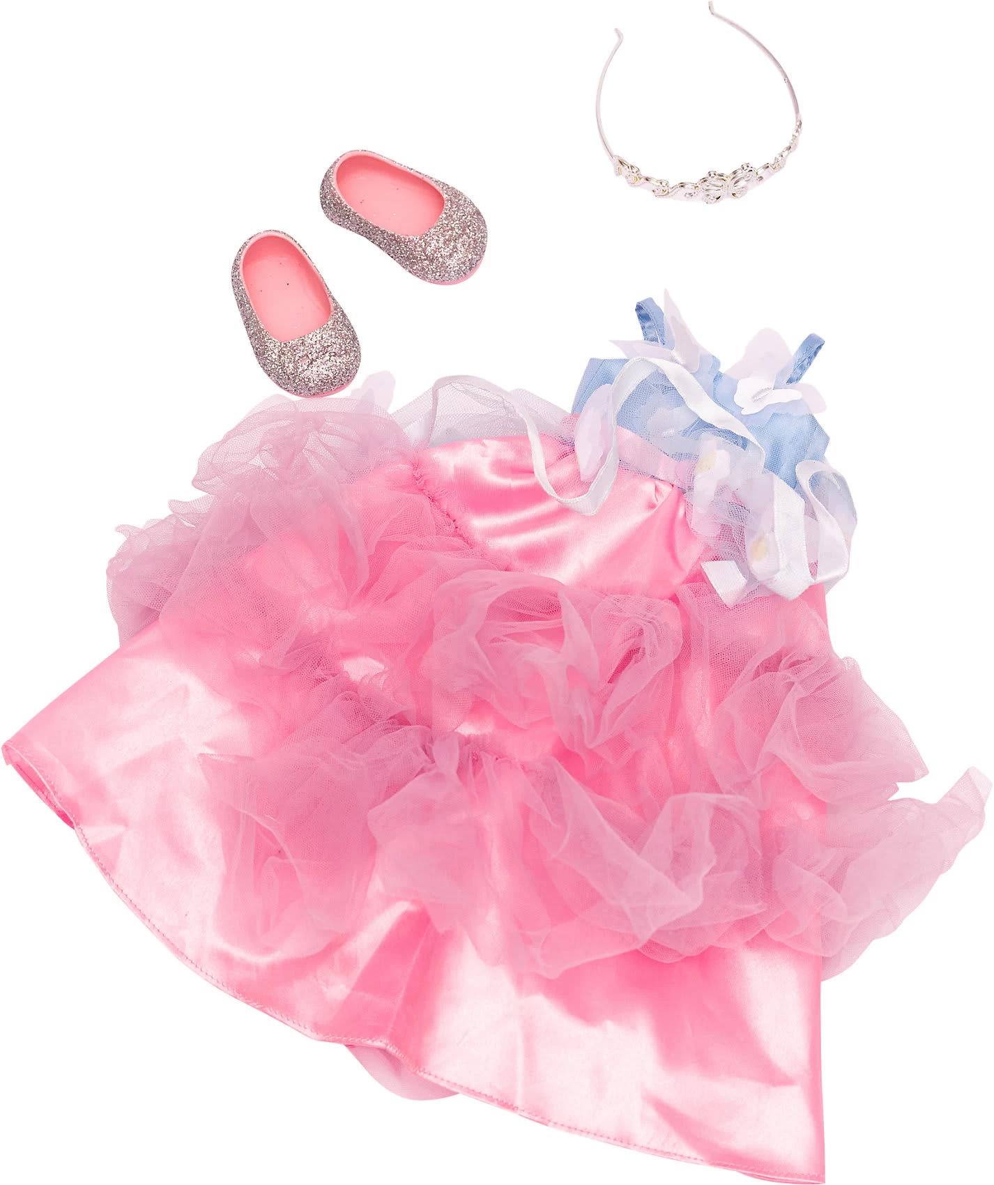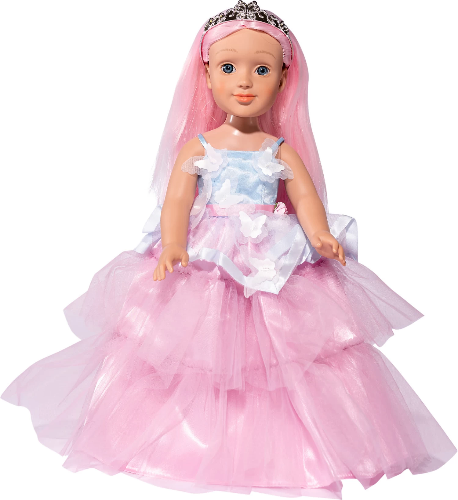 Mit diesem romantischen, langen Tüllkleid in Pastellfarben, rosafarbenen Glitzer-Ballerinas und einem wunderschönen silberfarbenen Diadem wird sich deine I’M A WOW-Puppe wie eine echte Prinzessin fühlen. L 6cm