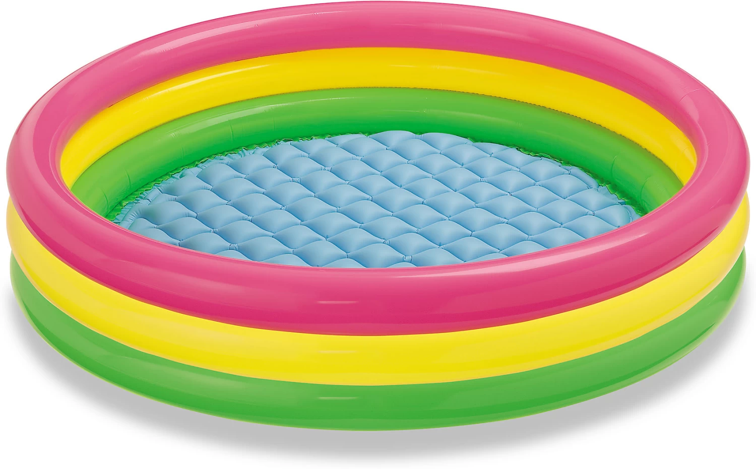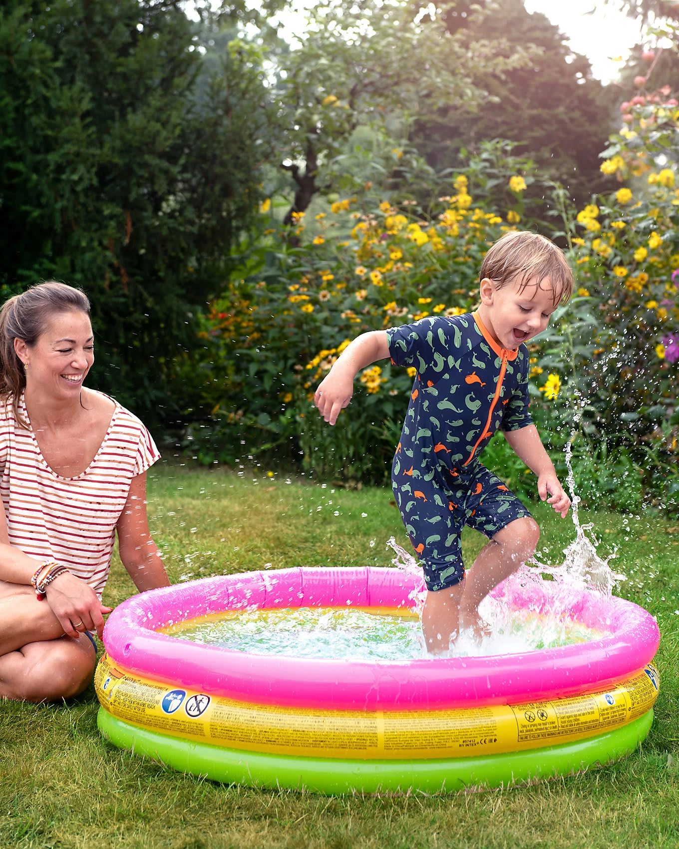 Der farbenfrohe Babypool mit 3 Luftringen und aufblasbarem Boden sorgt für mehr Sicherheit und Bequemlichkeit beim Baden und Planschen. Der Pool besteht aus haltbarem Vinyl-Material.