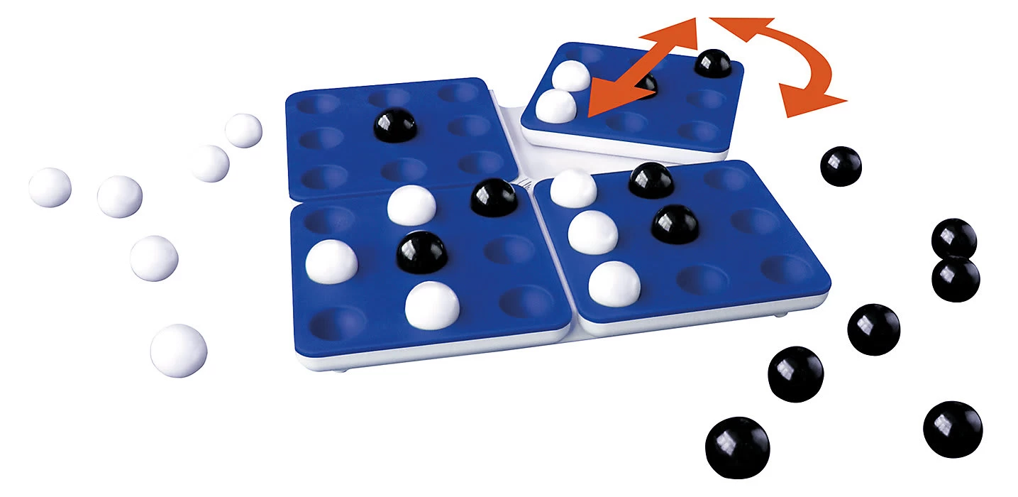 Die Spieler setzen abwechselnd jeweils eine Kugel auf das Spielbrett. Der Spieler, der als Erster fünf eigene Kugeln in einer Reihe hat, gewinnt das Spiel. Was auf den ersten Blick einfach wirkt, ist ganz schön knifflig, denn nach jedem Setzen dreht der Spieler eines der vier Quadrate und schon sieht das Spiel ganz anders aus.
