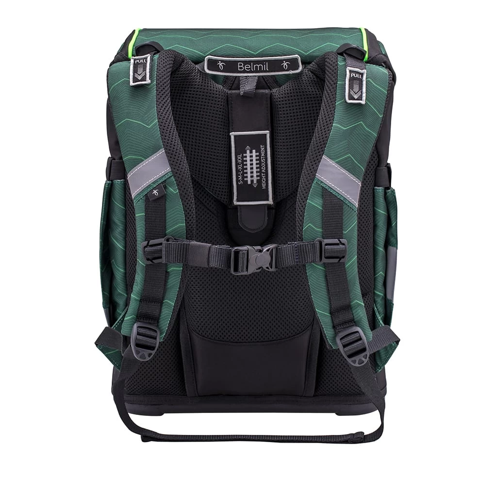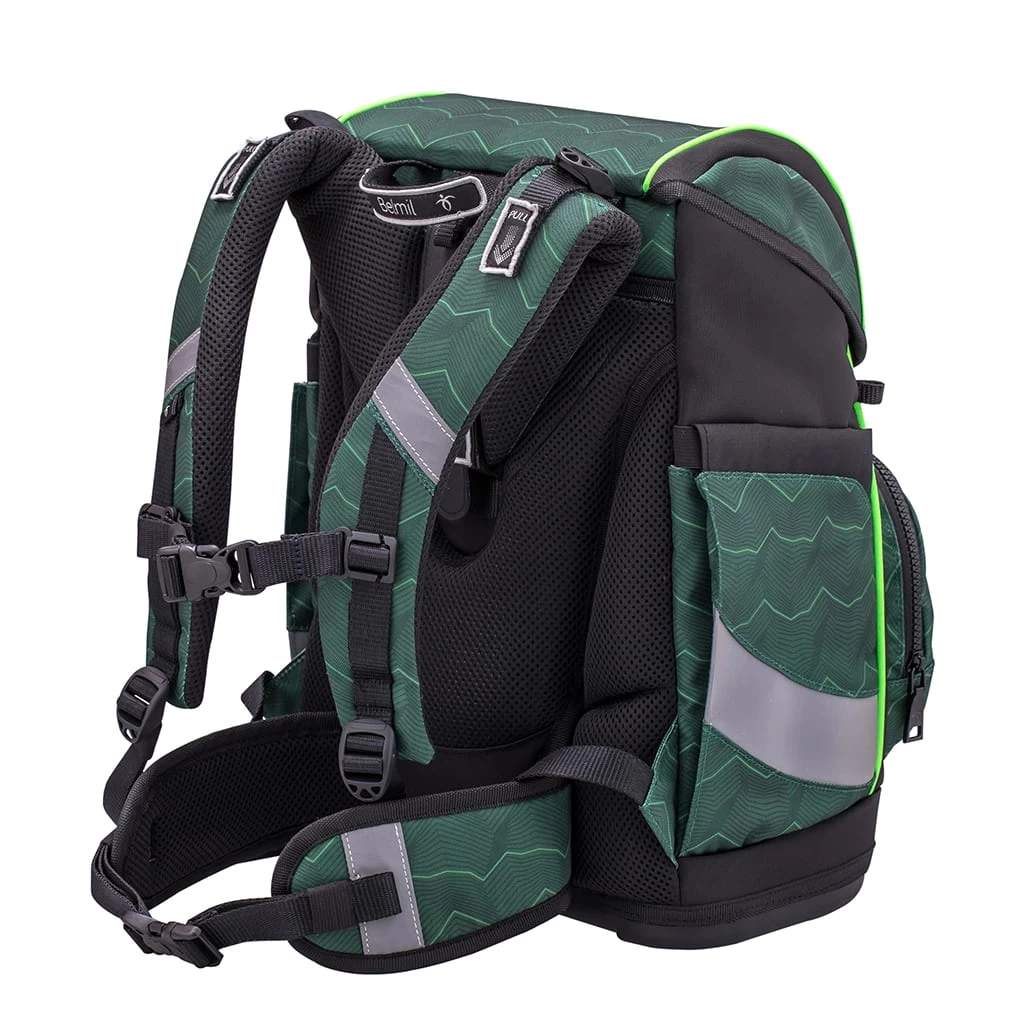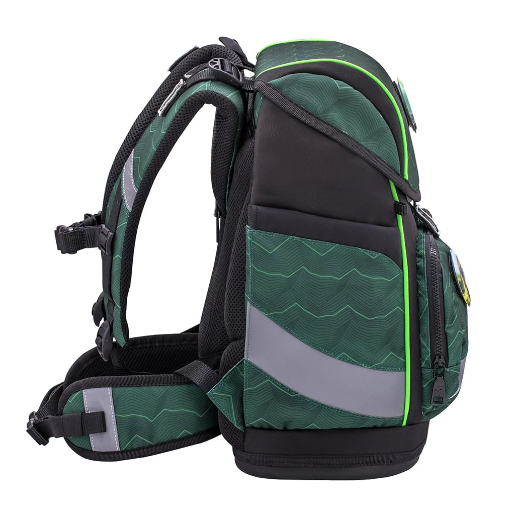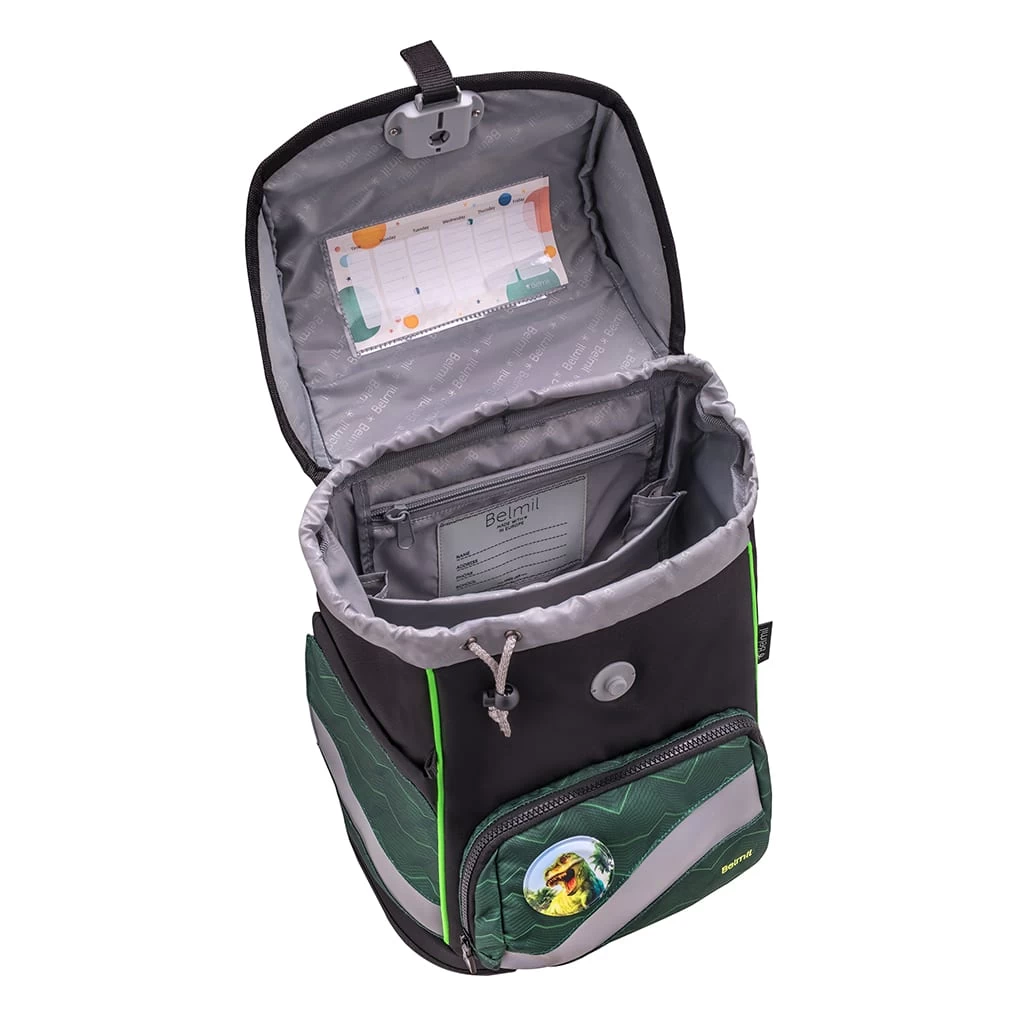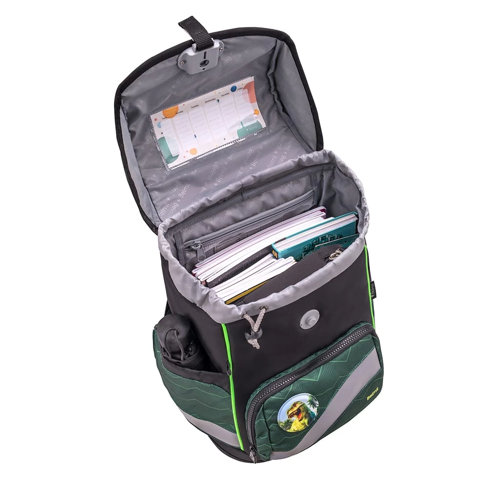 Große Vortasche, praktisch aufgeteilte Fächer, die den Kindern helfen, ihre Schulsachen besser zu organisieren, elastische Seitentaschen (bis zu 0,7 l) und eine extra Halter mit Kordelzug