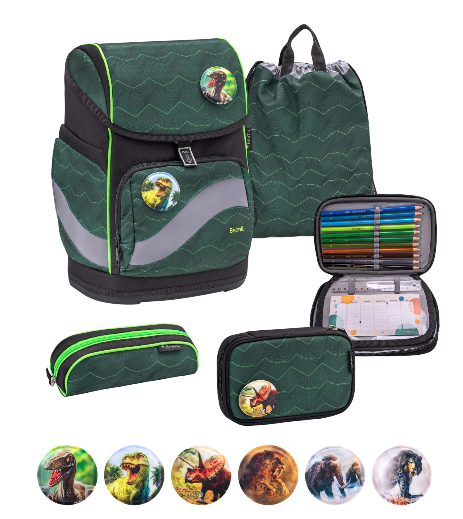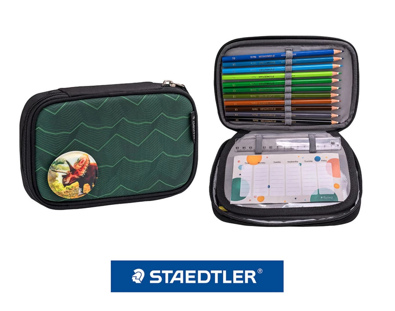 Das Set besteht aus: 1 Schulranzen; 1 Federtasche gefüllt mit STAEDTLER Produkte ; 1 Federmäppchen; 1 Turnbeutel; 1 Schlüsselanhänger; 6 Stck. Patchies* nur für ausgewählte Designs