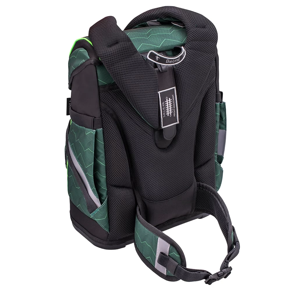 Ein Beckengurt/Hüftgurt mit weich gepolsterten Beckenflossen sowie ein längen- und höhenverstellbarer Brustgurt fixieren den Schulrucksack sicher am Körper