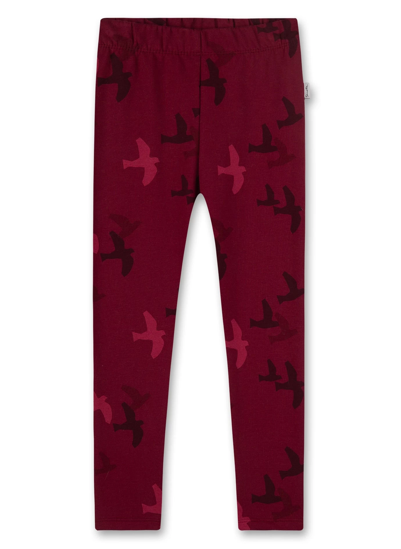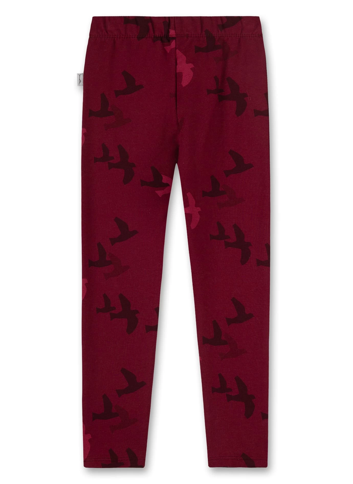 Dunkelrote Mädchen-Leggings aus einer weichen Sweatware mit einem stilvoll gestalteten Vögel-Alloverprint von Sanetta Kidswear.