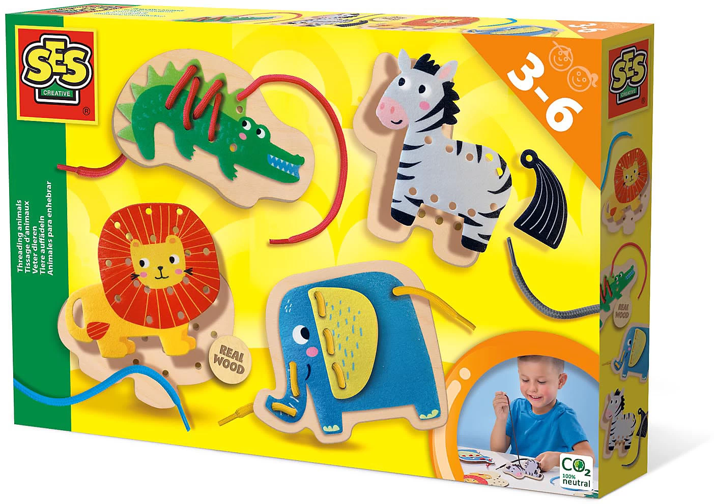Auf zum tierischen Fädelspaß! Bei diesem Set „Tiere Auffädeln“ von SES Creative sind ein wachsames Auge und handwerkliches Geschick gefragt. Ob Löwe, Krokodil oder Zebra – alle Filztierchen müssen zuerst auf die passende Holzvorlage gelegt und anschließend Loch für Loch mit Schnürsenkeln daran befestigt werden. Huch, da gibt‘s ja noch ein großes Ohr und einen schwarzen Schweif! Zu welchem Tier gehören diese Filzteile denn? Sobald das geklärt ist, lassen sich auch diese Teile im Handumdrehen an der Holzvorlage befestigen. Eine Anleitung erklärt die einzelnen Schritte ganz genau – da kann gar nichts mehr schiefgehen. Dieses Set stärkt spielerisch die Hand-Auge-Koordination und die Feinmotorik. Dann mal ran an die Schnürsenkel, fertig und fädeln!