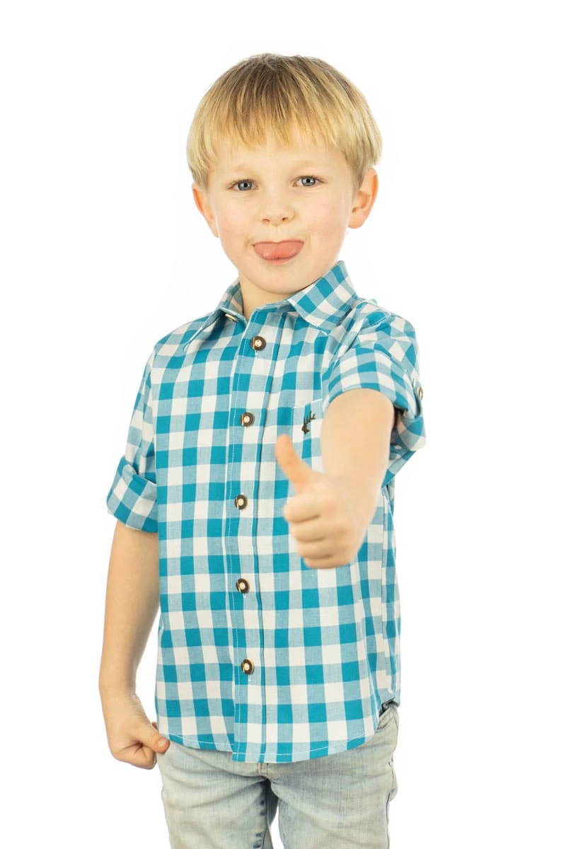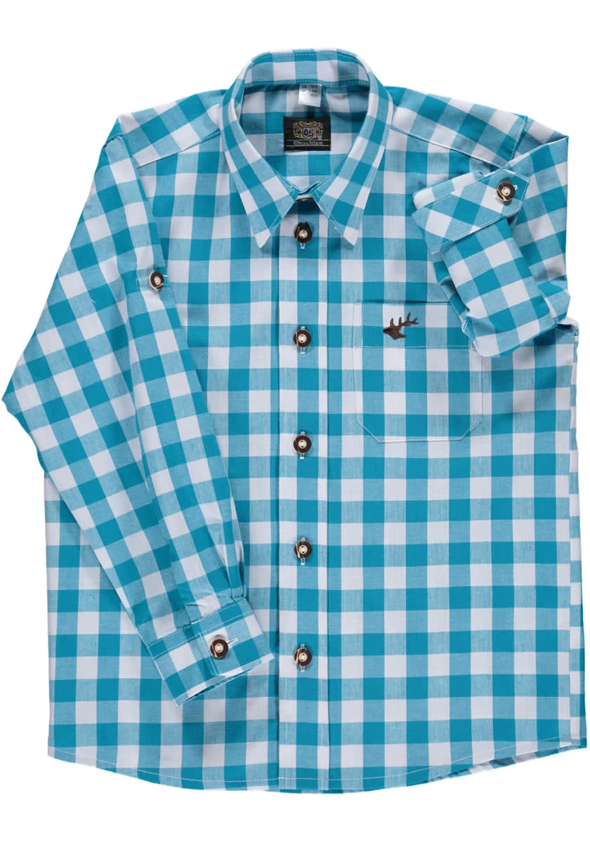 Kleine Kerle – große Karos. Besonders frisch wirken die fünf verschiedenen Farben; jeweils kombiniert mit klarem Weiß. Und sie haben alles, was ein Trachtenhemd ausmacht: Knöpfe in Hirschhorn-Optik, eine kleine Stickerei auf der Brusttasche und bequeme Krempel-Ärmel. Von Größe 74 bis 182 vom Spezialisten OS Trachten erhältlich.