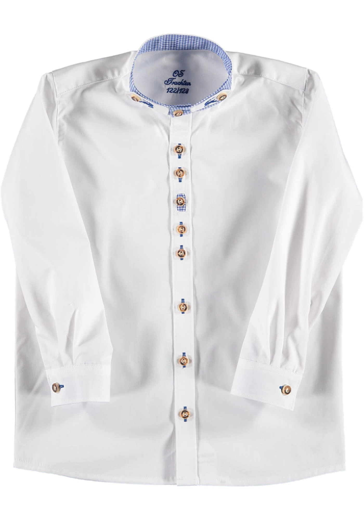 Strahlend weiß kommt dieses Trachtenhemd für den Nachwuchs daher. Schöner Akzent dazu: der blau-weiß karierte Besatz im Stehkragen, der zudem mit Riegel, Knopf und Hirsch-Stickerei geschmückt ist. Mit langen Ärmeln, aus reiner Baumwolle gefertigt. Von Größe 74 bis 182 lieferbar.