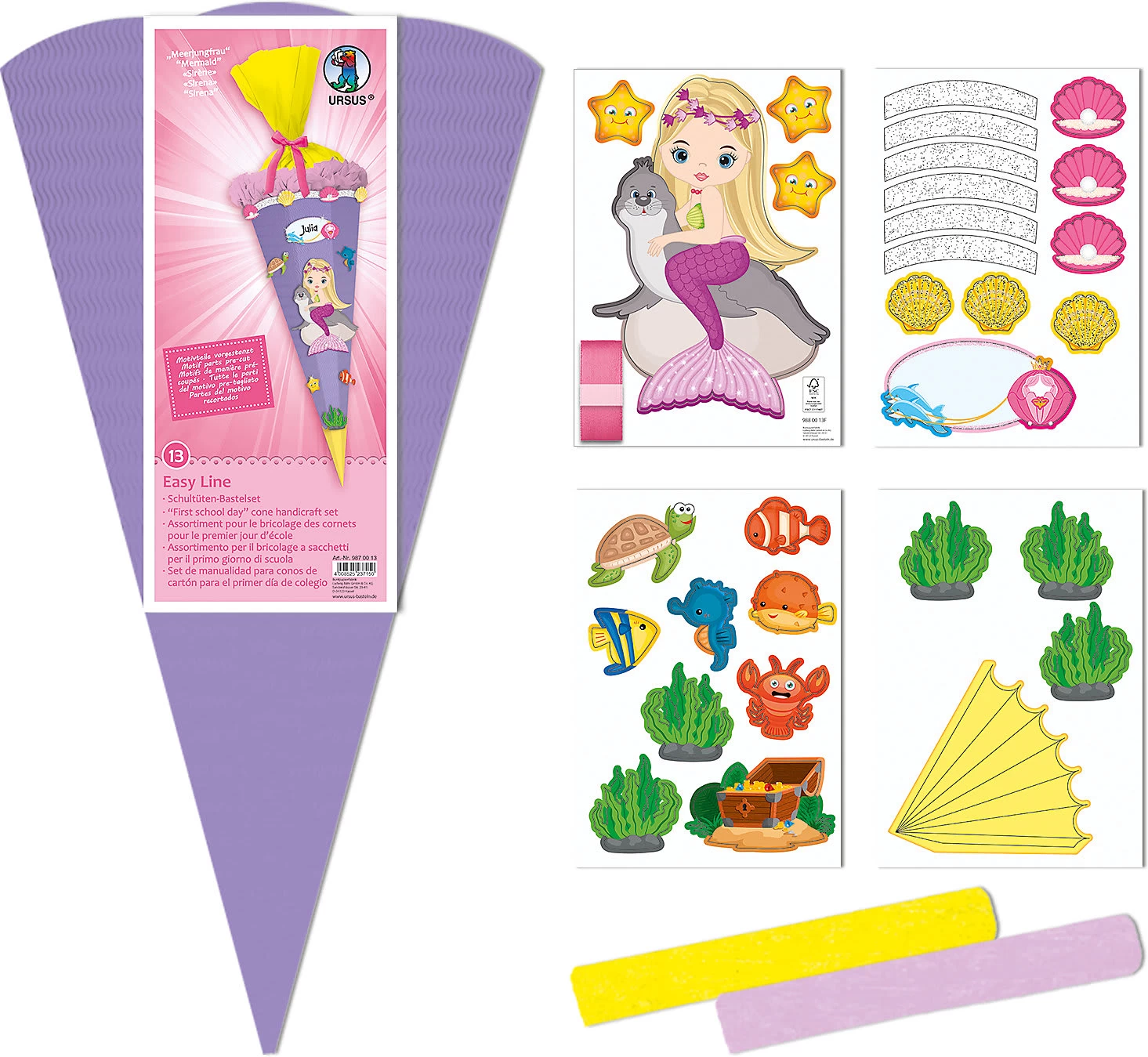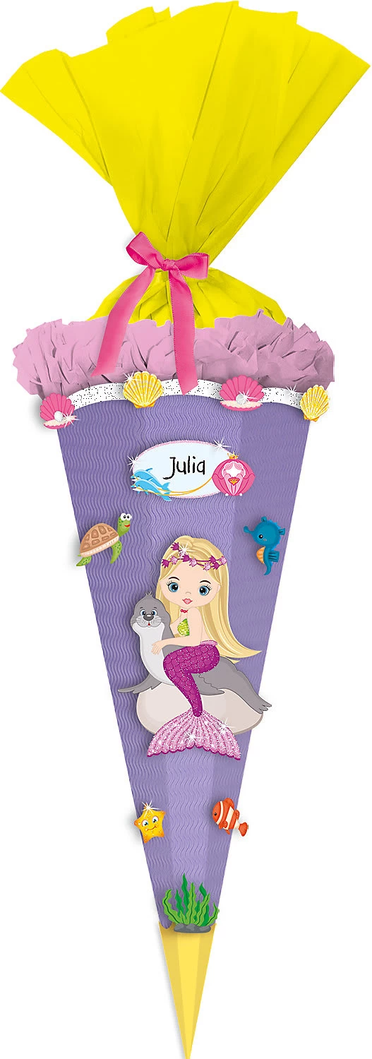 Kleine Meerjungfrauenfans kommen aus dem Staunen gar nicht mehr heraus, wenn der neue Begleiter für den ersten Schultag mit ihrer Lieblingsfigur ausgestattet ist. Das Set von URSUS enthält einen Schultüten Rohling, dem mit den dazugehörigen Motiven ein märchenhafter Look verliehen werden kann.