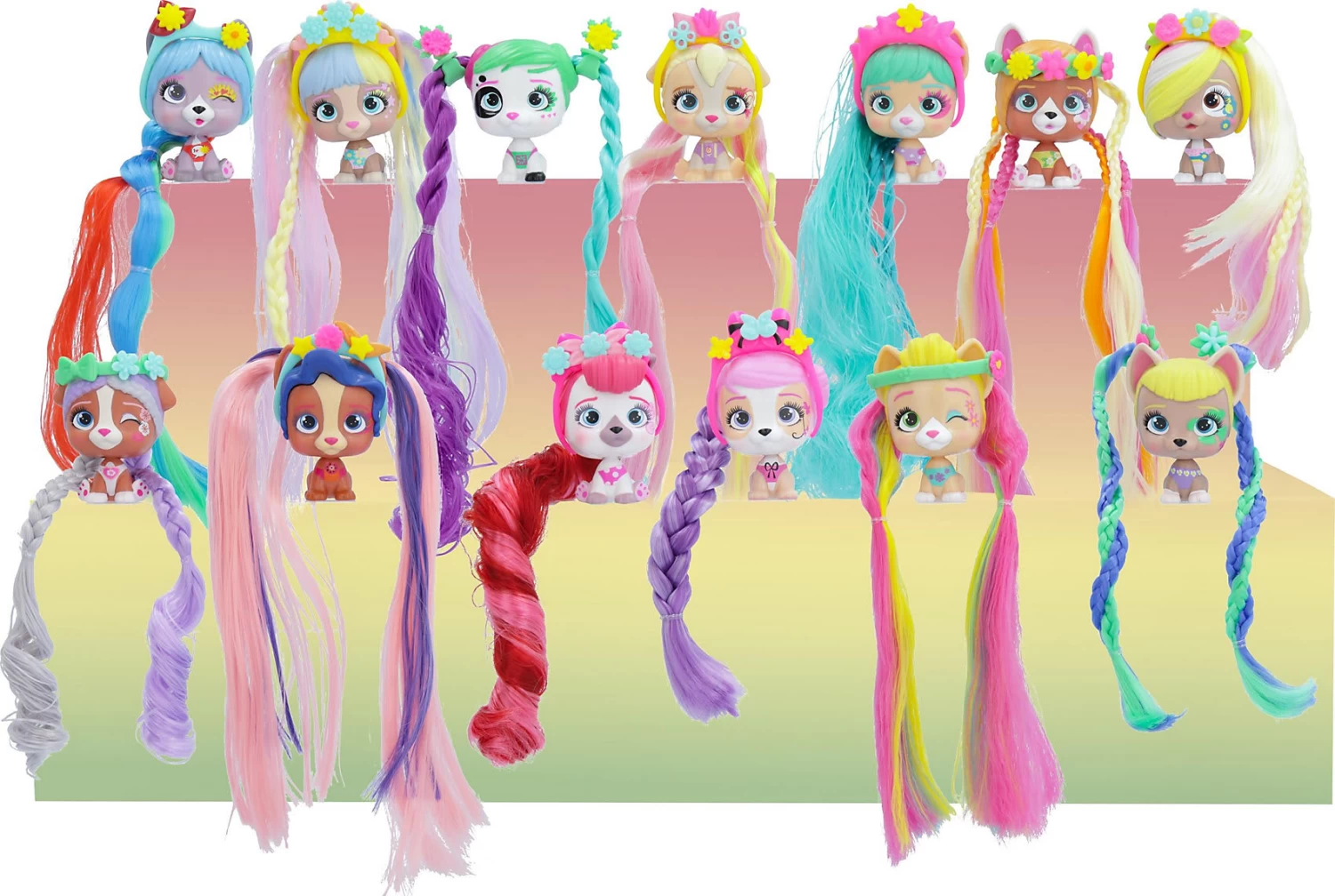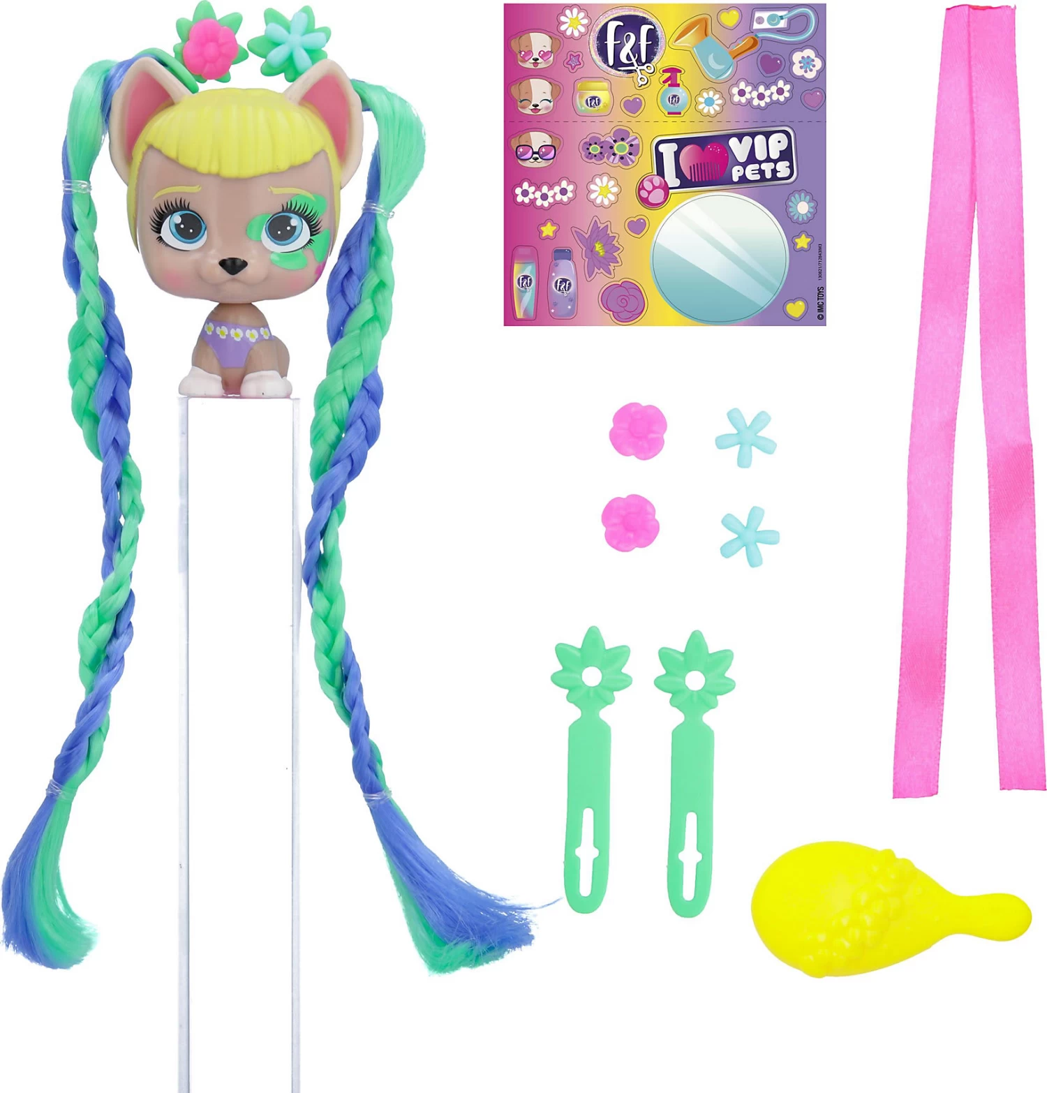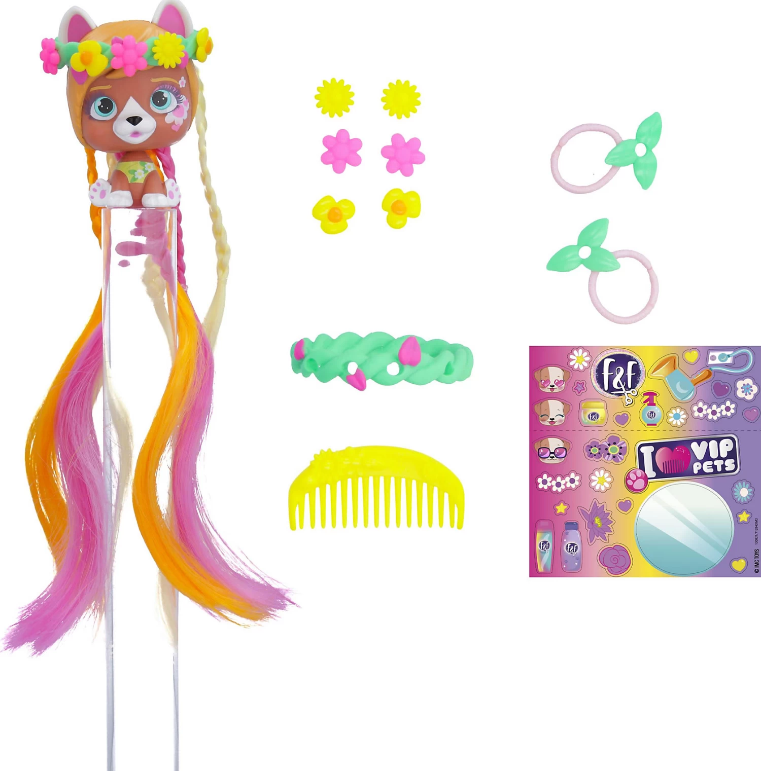 Mit dieser VIP Pets Mini Fans Spring Vibes Puppe von IMC Toys ist farbenfroher Stylingspaß garantiert! Das Set enthält eine der fröhlichen Puppen mit super langen Haaren, die mit den drei enthaltenen Accessoires gestylt werden können. Mit dabei sind auch ein Sammelflyer, ein Stickerbogen und die Verpackung, die gleichzeitig als Spielkulisse dient.